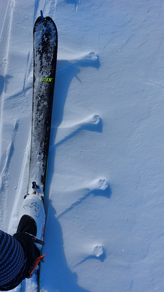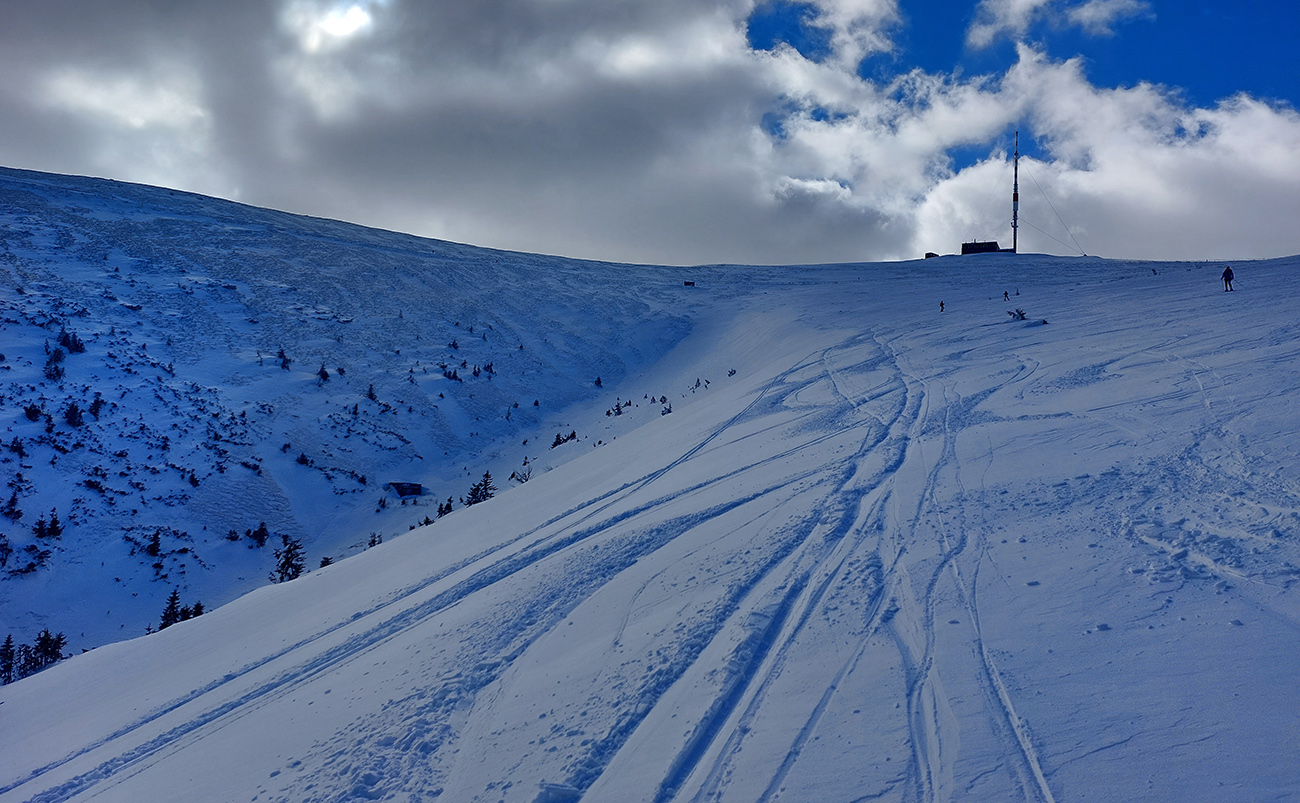 Potom už sa terén otvára a porast znižuje až do kosodreviny, pod pásmi konečne prašan, preto krátky sklz do malej jamky je pohodový aj na pásoch. Len pri návrate tu bude treba lyže do rúk vziať – jedného domáceho tak aj stretám, už sa vracia a dáva mi tip, ktorý odhadujem aj sám takto na diaľku, pri pohľade na Hoľu: nelyžovať nazad od vysielača po značke, ale bokom po hrane žľabu.