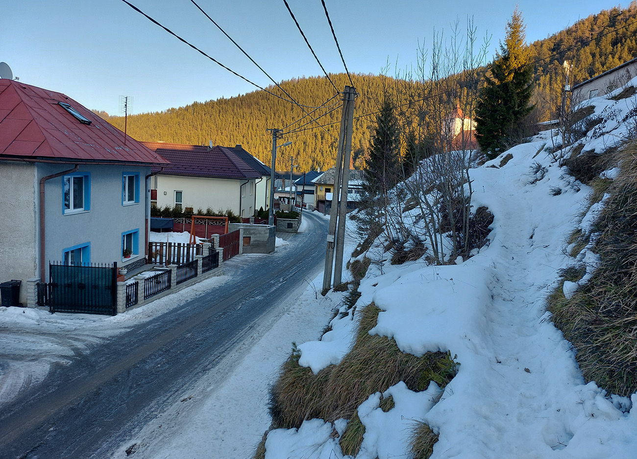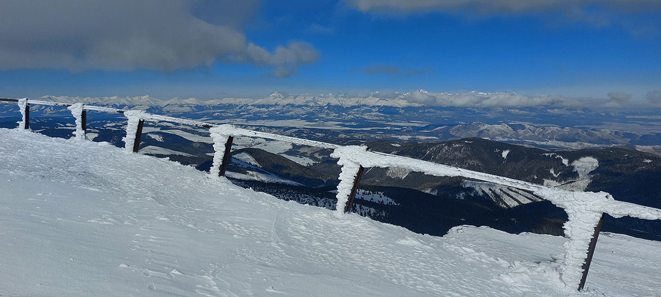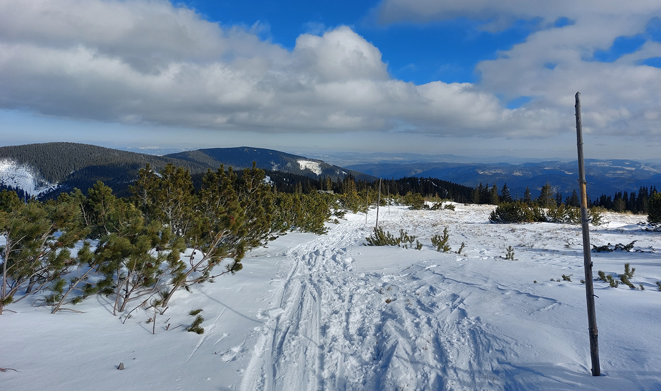 Okolo Martalúzky síce pribúda výhľadov, ale znovu rapídne ubúda snehu. Na výstup dosť, aj keď už miestami po brusniciach stúpam a na kamienky treba dať pozor. Oproti schádza od vysielača človek a hrôza ma chytá, lebo má lyže na chrbte. Príde ale bližšie a našťastie sú to bežky, ufff. Vraj prvý z masového prechodu Šumiac – Kubachy. Tak dúfam, že peší účastníci moc nerozbijú stopu v lese a kľučkujem ďalej v ústrety vrcholu. Miestami je to skoro na haršajzne, aké je to ľadové, aj povrch je tvarom „ľadových zubov“ podobný rašpli tam, kde nejaký súvislý ľad je. Ale to až vyššie, okolo zákruty cesty. Tak tadeto dole veru nie! Tých pár oprotizjazdujúcich aj odkláňam k hrane žľabu, nech sa netrápia popri tyčovom značení.