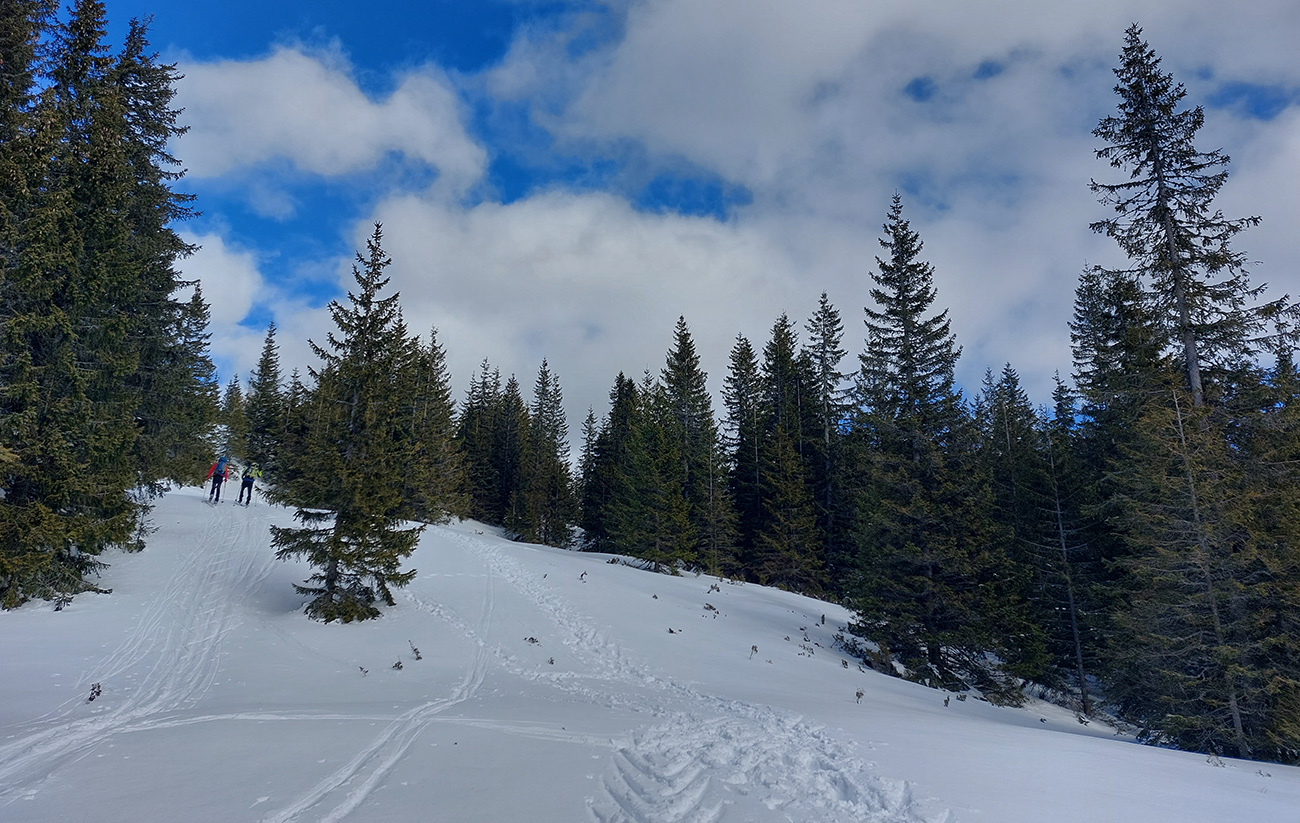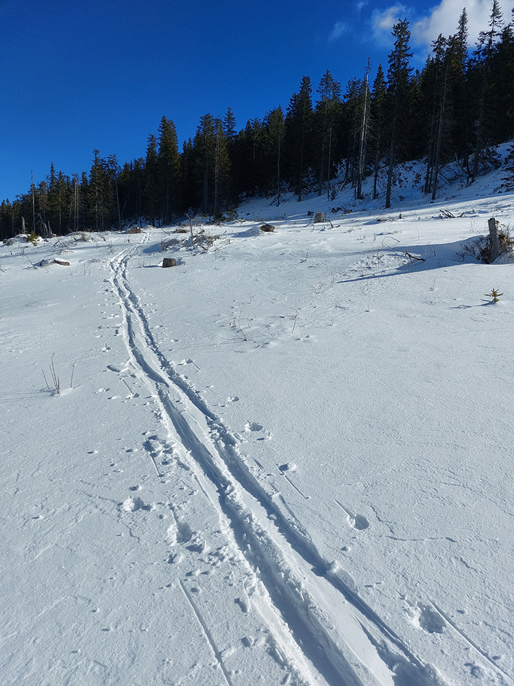 Od rázcestia Morna stopa širšia a viac preleštená smerom na Prednú hoľu, doprava v mojom smere zrazu len zafúkaná „jednokoľajka“, ktorá sa na hnusných, obrovských rúbaniach miestami až stráca. Tak sa trochu motám, lebo ani značiek nieto. Motám sa aj preto, lebo miestami treba kľučkovať pomedzi konáre a pne. Ako som stúpal a s výškou sa otepľovalo, tu na severných svahoch zrazu naopak, poriadna kosa. Pozitívom sú nádherné výhľady na ranné Tatry napravo, ale aj čerstvý poprašok pod lyžami, konečne idem tichšie.