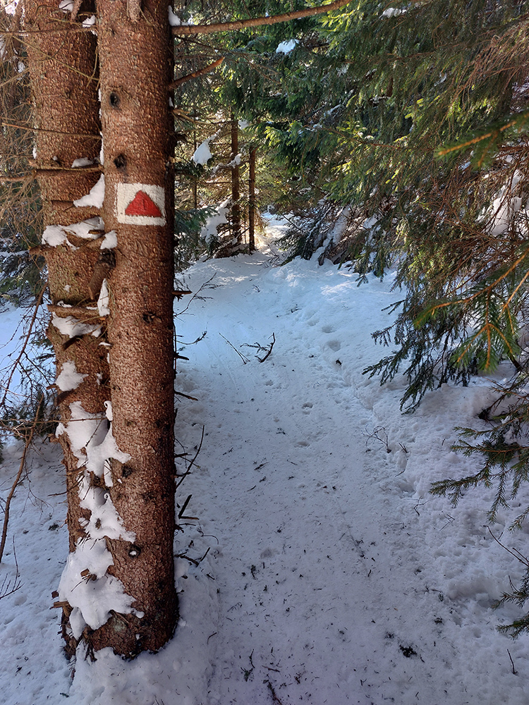 Za smerovníkom Smrečinského sedla začína najväčšia sranda dňa: stopa síce preleštená, ale odbočuje od modrej značky kamsi doľava dole a na značke len súvislé lesné bielo. Neznalý miestnych pomerov si myslím, že to niekto predo mnou sa zamotával, tak prerážam stopu poslušne po modrej. Aj tu sa párkrát zamotávam, keď značky nevidieť, alebo keď ma zlákajú takéto betónové „kilometrovníky“: