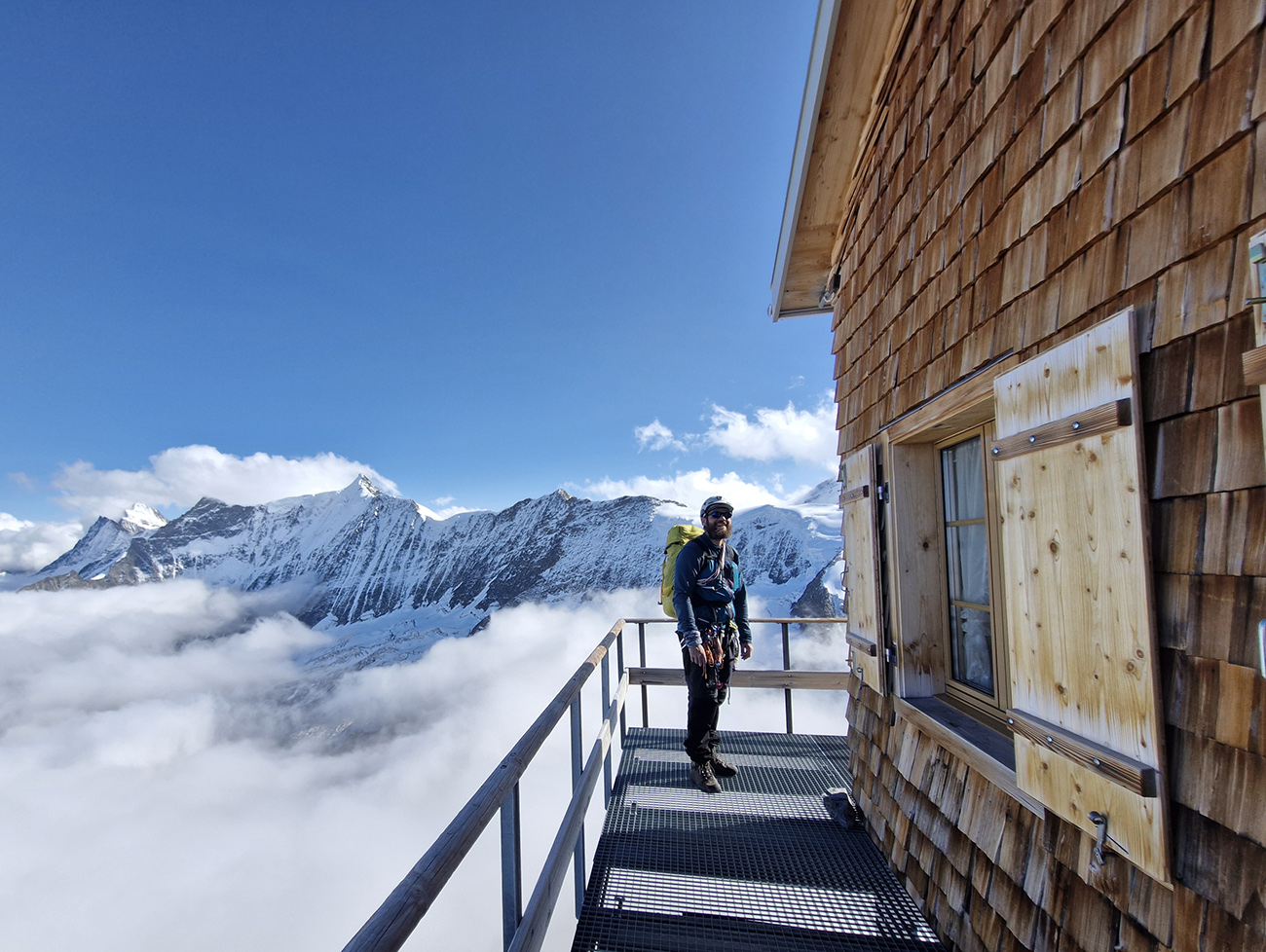 Zubačka: V celej zubačke sme jediní horali. Zbytok tvoria najmä japonskí a indickí turisti v poltopánkach a mestských kabátoch. Na medzistanici Eismeer má zubačka krátku fotopauzu. Vyskakujeme so zbytkom vlaku, ale na rozdiel od nich sa do neho po desiatich minútach už znovu nevraciame. Keď sa nástupisko vyprázdni, nájdeme správny tunel a vylezieme cez storočné dvere na malú platformu 25 metrov nad ľadovcom. Otvorí sa výhľad na celú dolinu pod JV stenou Eigeru. Ľadovec vyzerá strašidelne - obrovské trhliny, každú chvíľu sa ozýva hučanie padajúcich serakov. Svieti silné slnko, na oblohe len pár mrakov, je nádherne. V diaľke na hrebeni Eigeru vidíme náš dnešný cieľ - chatu Mittellegi. Vraj dve hodiny.