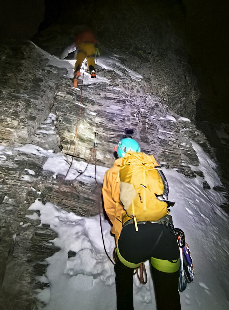Po úvodných metroch po úzkom, ale rovnom hrebienku s občasným snehom začína prvé lezenie. Prvé dva výšvihy sú suché, a hoci to v mačkách nie je ako v lezečkách, chata sa vzďaľuje a postup je rýchly. Vo štvorici si potvrdzujeme, že zatiaľ fajn.