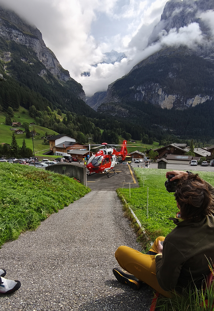 Keď sa znovu objaví lano od helikoptéry, Jonas ho chytí, cvakne do postroja, zdvihne ruku, a za menej ako sekundu so S vystrelíme do vzduchu tridsať metrov nad hrebeň. Vidím malého Jonasa, ako zostal sám na našej platforme, trochu viac v diaľke mlaďasov, ako nás fotia, a hlboko pod nami rozvrásnený ľadovec, čo včera v jednom kuse hučal. Mám srdce v krku, pomaly sa točíme, a vnímam približujúci sa hluk rotora, ako nás lano pomaly vyťahuje hore. Prelietame ponad hrebeň a potom zasneženú, ikonickú a strašidelnú severnú stenu Eigeru, a o pár minút nás už spúšťajú na trávnik v Grindelwalde. Dole nás odstroja dvaja záchranári a vrtuľník odletí pre mladých. Všetko v poriadku? Bežte si sadnúť tam na schody, posiela nás s úsmevom záchranárka preč z trávnika. Je tu teplo.