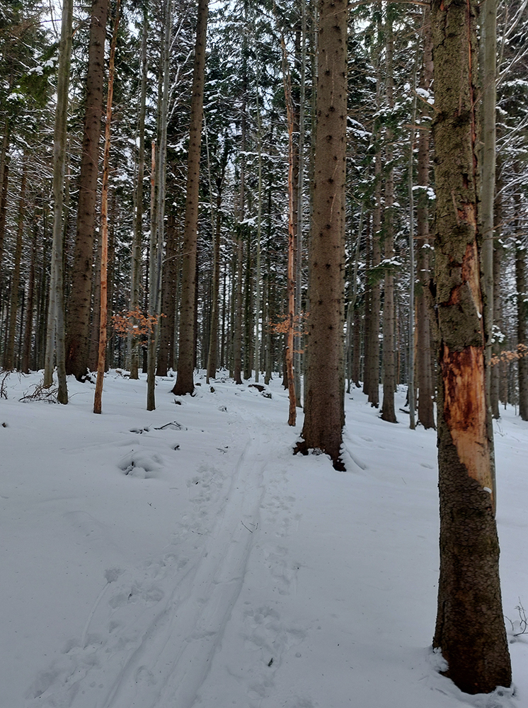 Jasná správa: kto chce ísť teraz na Hole na pásoch, oveľa lepšie spraví, keď pôjde z Vrútok a nie z Martina. Serpentíny zo Strání, spod starej lanovky (žltá značka) sú od mostíka také zodraté pešiakmi, že ažžžž. Zato od rampy v Jedľovinách, kde vyberajú poplatok za cestu, sa v podstate dá hore aj dole od auta. Zaparkovať je kde na dvoch malých parkoviskách hneď nad rampou. Cesta „investička“, ktorá odtiaľ vedie na tie Stráne, je spevnená, pokrytá pár cenťákmi autami ujazdeného a pešiakmi uchodeného snehu, ideál aj pre mtb. Síce na začiatku (medzi parkoviskami a za prvou zákrutou) cvakajú zubami húfy malých piraní, ale cestou hore je ľahké sa im vyhnúť a cestou dole sa dajú opatrne poobchádzať. Alebo už zniesť, je to k rampe ani nie 500 m. Od krmelca na prvom kopčeku je to už pohoda hore aj dole, samozrejme s trochou pozornosti. Takto to vyzeralo, len som na jednom mieste trochu experimentoval a moc to nevyšlo, na to upozorním nižšie. No v tejto biede treba improvizovať, čo už...