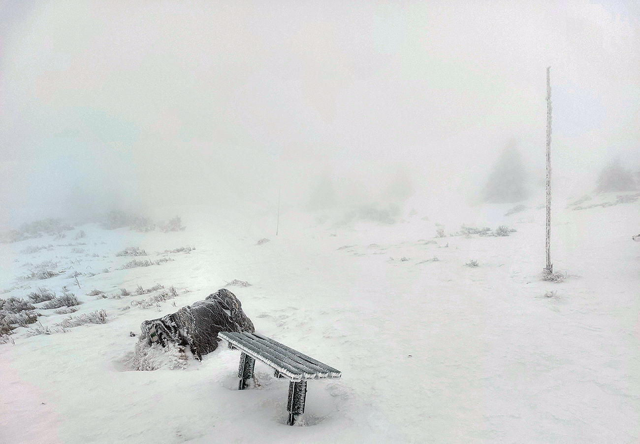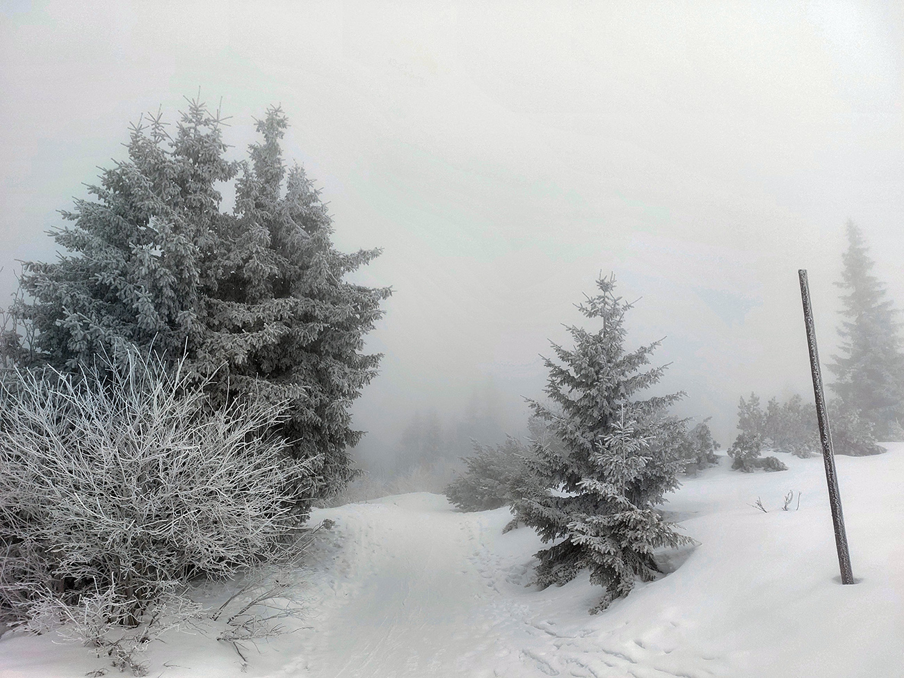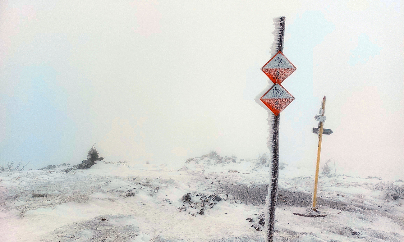 Neviditeľnosť gradovala aj vďaka slzám v očiach, ale dopotkýnal som sa až za Koniarky, do závetria. Opáčiť, či nebude lepšie cez Hole do Bránice zbehnúť. Ale tam chodník nie veľmi prechodený. Červená hrebeňovka tiež zaviata, prepadavá a neviditeľná. Tak nazad do sedla Bublen a davááj dole na Chrapáky, či je priechodný aspoň modrý traverz k lanovke. Samozrejme, že nebol.