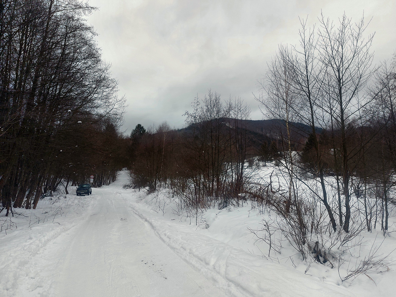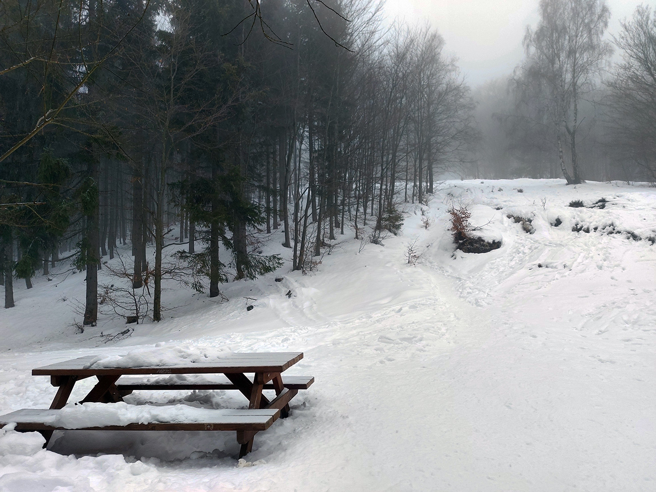 Potom skratka hore na drevosklad - tá už pre lyže nie je, ale ani tá nepodklzovala, proste ten pevný, aj keď navlhnutý podklad fajne držal. Aj smerom dole potom paráda. Rovnako na chodníku cez Ploštiny pod Generál, ktorého spodok bol tak na spodnej hranici mraku.
