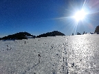 Tak to púšťame po východnom svahu dole k napájadlu. Je lepší ako susedný severný pod lesom, lebo tam slnko nesvietilo a prepadáva sa to tam. Tu pod lyžami pevno, na parádu.