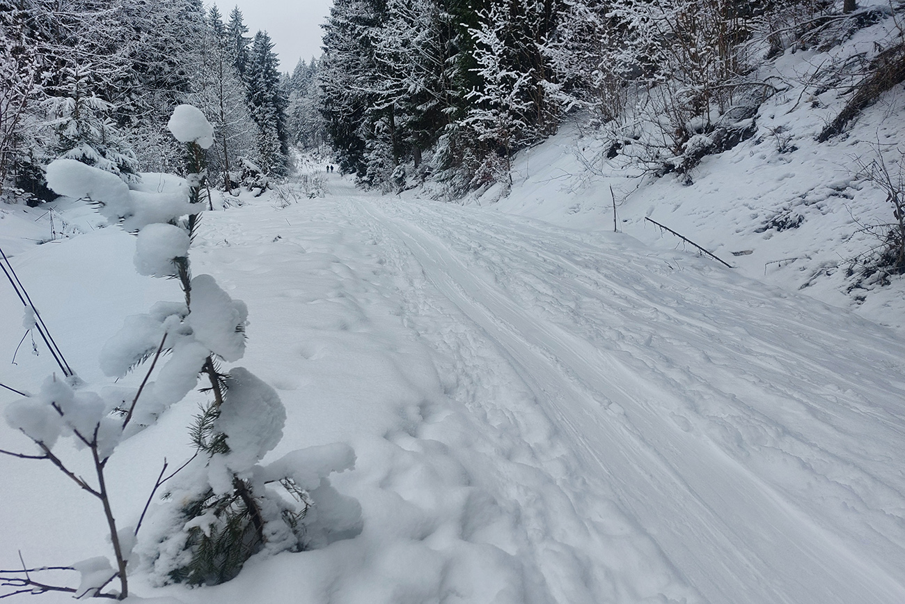 To už sme v mlieku a cestou po cyklotrase pod Šiprúň obzeráme mega dlhé námrazové ihličky na každom konári. Krajina omrznutá ako v rozprávke. Občas sa to niekde so šuchotom zosunie.