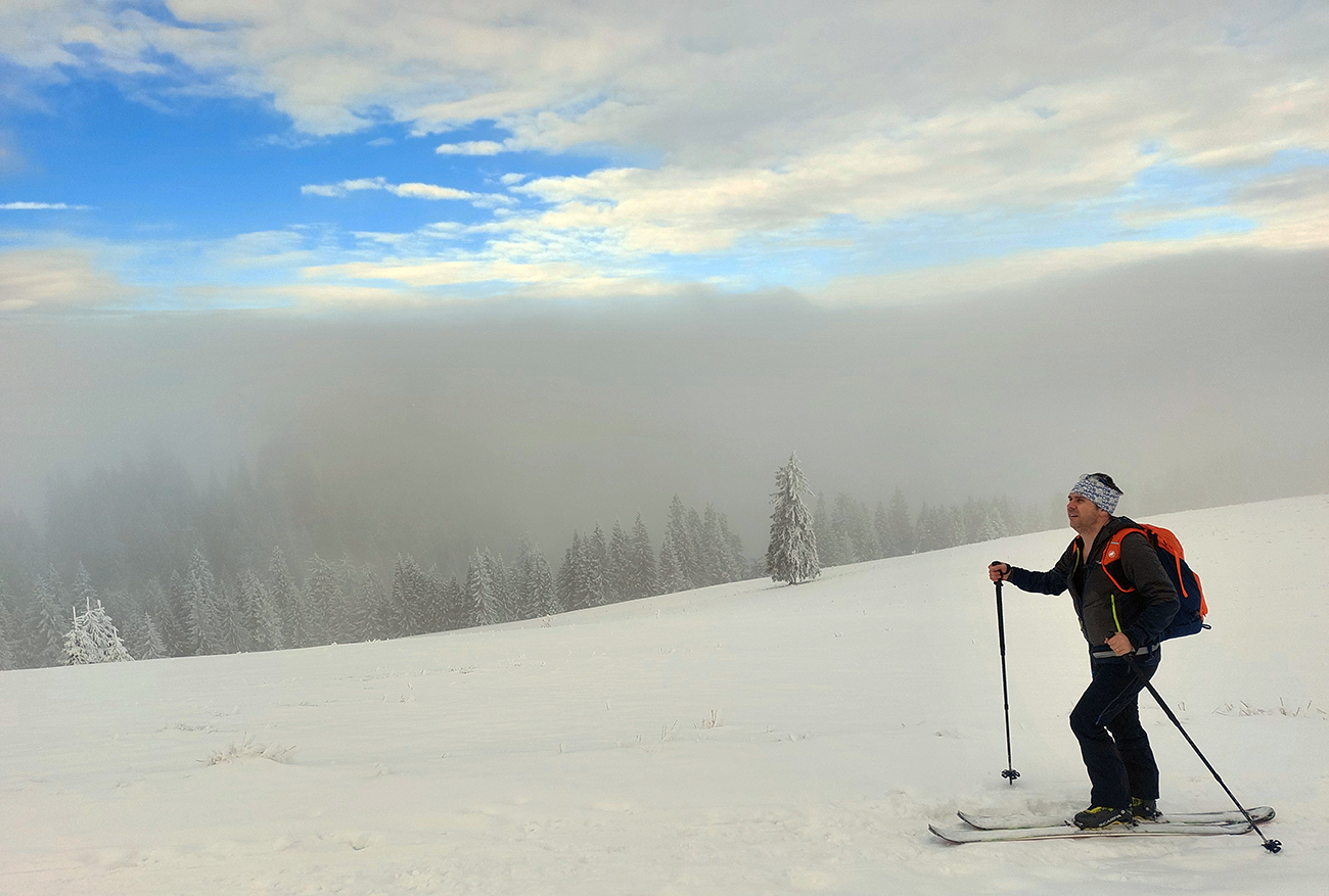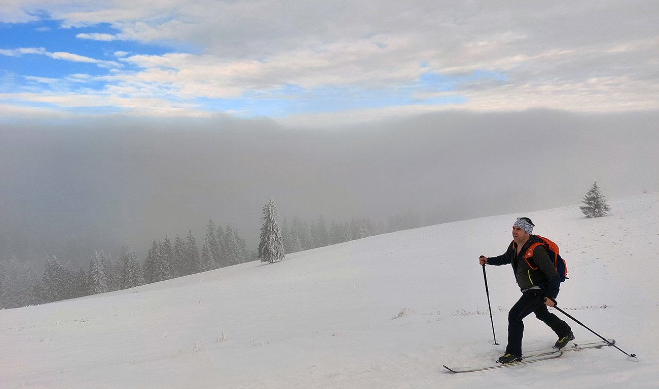 Pri traverzovaní popod Šiprúň sa ukazuje v chuchvalcoch hmly aj pás modrej oblohy. Aj keď vieme, že na Smrekovicu nedôjdeme, pohodovo ťaháme až na lúky nad Nižným Matejkovom. V komfortnej a rýchlej stope.