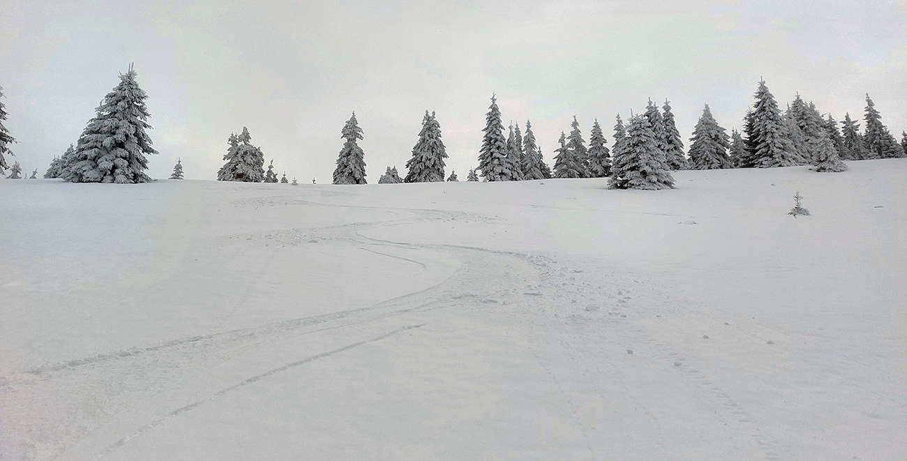 Rozpačitá zima, rozpačité počasie. Aladiny hlásia zamračené, vo vysokých polohách mliečno. V nižších nieto snehu, treba trafiť medzivrstvu! Sever Veľkej Fatry je na to ideálny, ideme ta. Chceli sme síce na Smrekovicu, ale zabudnuté reťaze, tak radšej len do Hrabova a odtiaľ hore. Aj s garanciou pohodlného zlyžovania potom dole. Takže po krátkom pešovaní od „Skialp Parkingu“ naskakujeme do lyží pod lanovkou a po chvíli ťapkania po piste už točíme doľava na Medvediu cestu. Posnežilo asi milimeter, zakrylo medvedie kamienky, ale len tak esteticky, začiatok nie je príjemný. No rýchlo sa to zlepšuje. Ešte krátky a strmší úsek pred východom na Vlkolínske lúky je plný kameňov, ale smerom hore je to ok. Dole už by som tade nešiel.