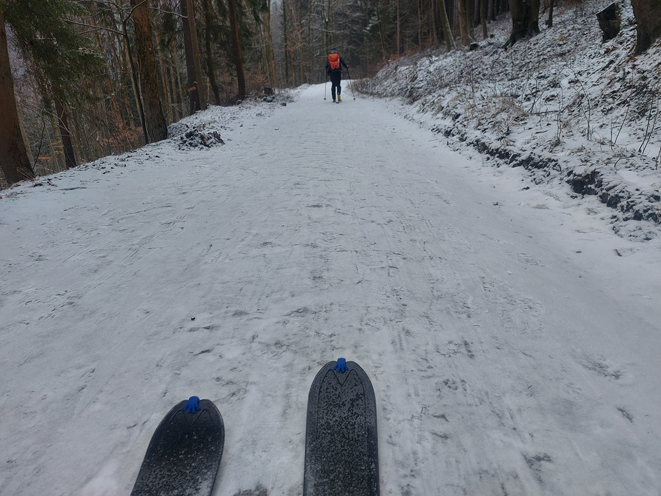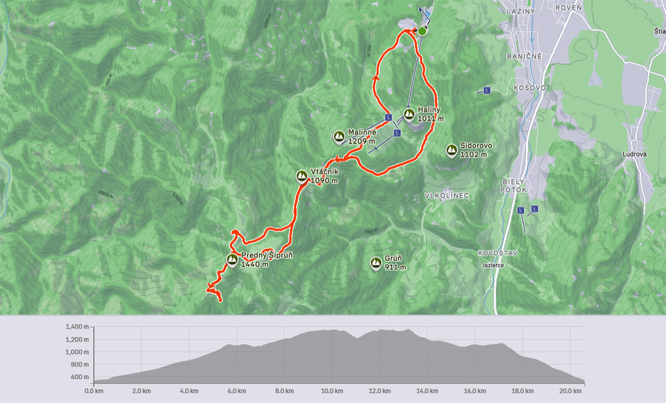 Potom už len odjazd nazad pod Vtáčnik. Zvážnica je pod dostatkom snehu, aj vyjazdená, takže zákerné šutríky vidíme. Záver už na pásoch, aj dole po cyklotrase a popri Mederlyčke na zjazdovku. Tam ku koncu v hustom lese samozrejme snehu najmenej, aj je zabordelovaný, ale aspoň sa na tom starom ľade nešmýka.