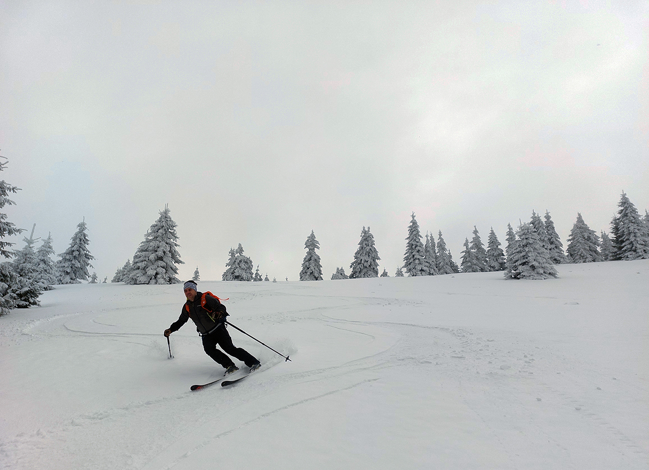 Na „otočke“ sa hmla na chvíľu odporúča, tak rýchlo využívame a skúšame pár oblúkov dole lúkou. Dobré to je na túto biedu – na pevnom a drsnom firne nejaký cenťáčik nového snehu. Síce to škrípe, ale aj drží. Spúšťame až medzi stromy a keď už je úzko a strmo, otáčame nazad hore.