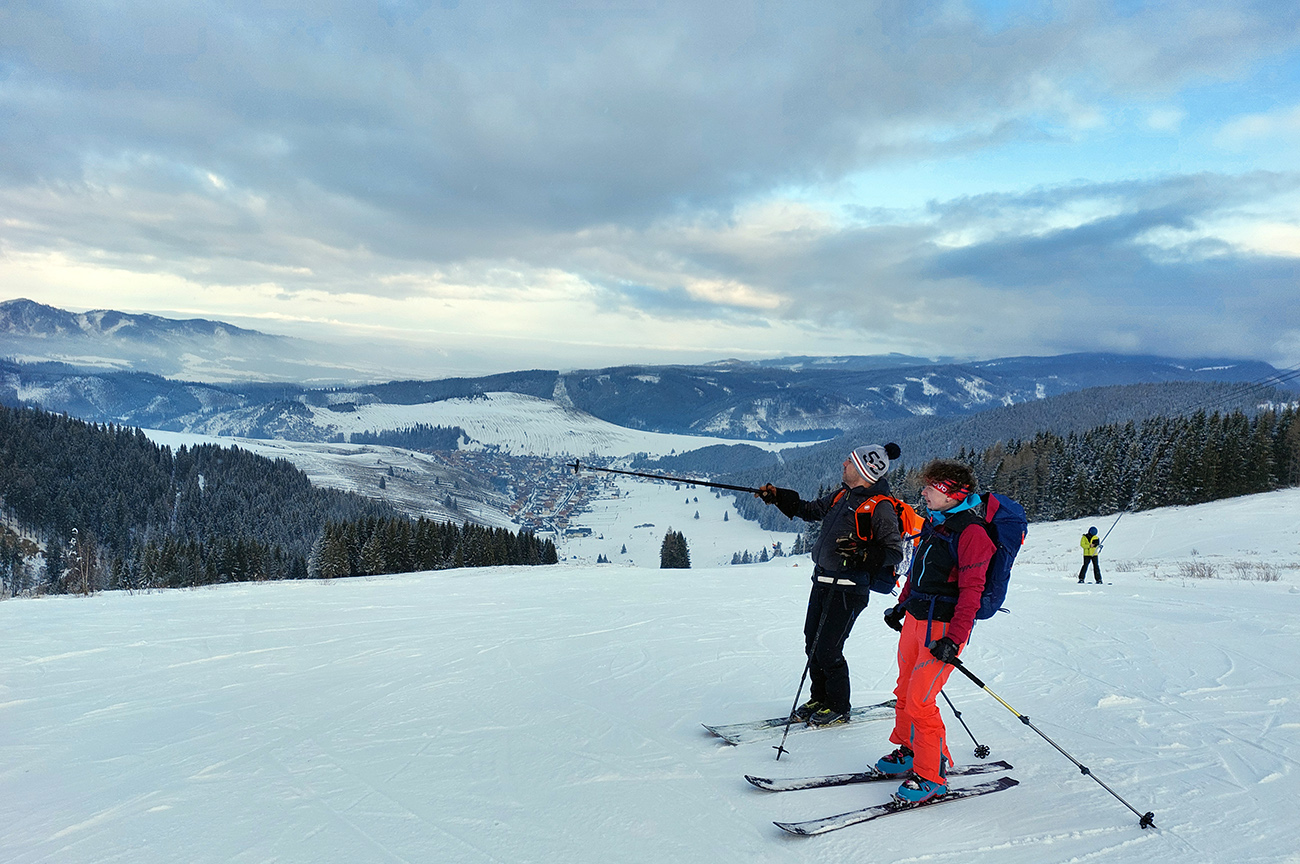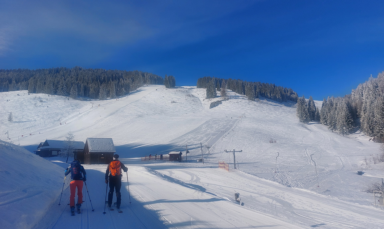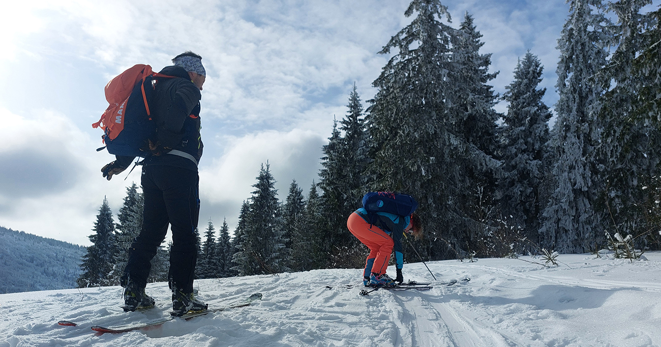 A vôbec to po odmäkoch nebolo ľadové, na starom firne ľahký, premrznutý poprašok, pohodlné! Takže super aj neskôr, pri zjazdoch na pásoch – netrpeli chlpy na ľade a ticho bolo. Hore nad lesom pekný spätný výhľad na Tatry, kde sa ozaj na hrebeňoch dáke chuchvalce držali, zdalo sa: