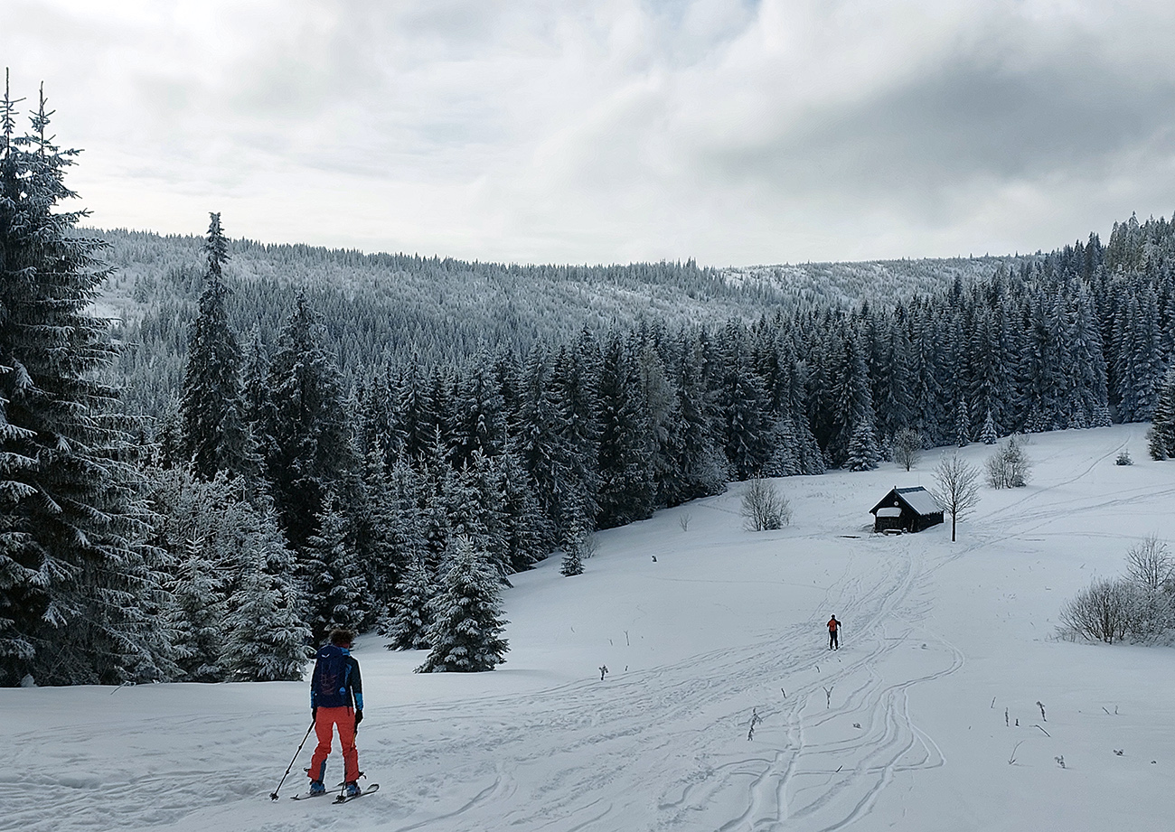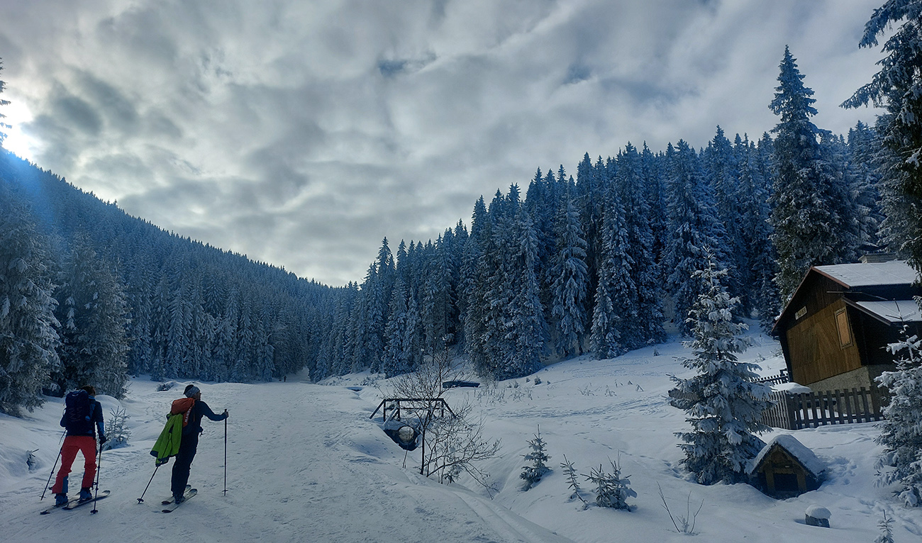 Dalo by sa pokračovať v oblúkovaní až na dno Ždiarskej doliny k tomu smerovníku, ale že radšej nalepíme a prepásujeme sa k tej svetoznámej „búde nárekov“. Lyžovačka pre spestrenie vraj cestou nazad, možno...
