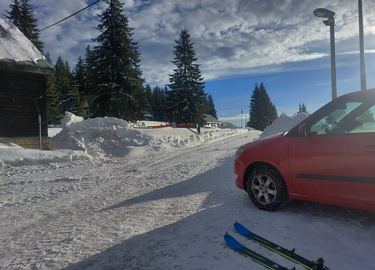 Cesta z Podsuchej parádne vysnežená, ujazdená, rovná, vypluhovaná ako vždy - na dobrých gumách hádam aj bez reťazí by sa dalo. Hore parkovacia rampa a že vraj ak spravíme biznis v reštike aspoň za päť Eur, parkovné (2,5 Eura za hodinu) nám blahosklonne odpustia. Inak dobrá taxa, teeeda... Parkovisko plné, no rampa dozadu ku garážam otvorená, tak sme to zapichli tam a vedeli sme, že „dnes sa bude dať od parkoviska“. Toľko logistika.