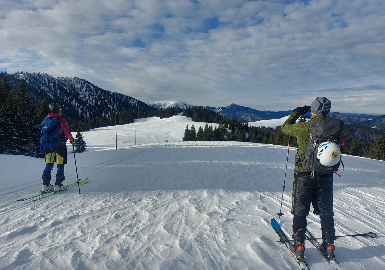 Prvý cieľ, že smer juh. Na tvrdom, starom ľade jemný poprašok od skoro nuly po dákych 10 cm, niekde vietor aj viac navial. Pásy išli tichúčko a mäkkúčko. Front v nedohľadne, teplota málo pod nulou, slnko takmer na plný výkon, dohľadnosť ďaleká, paráda! Rozhodli sme sa skúsiť Rakytov, aj keď najprv bola v hľadáčiku Ploská: