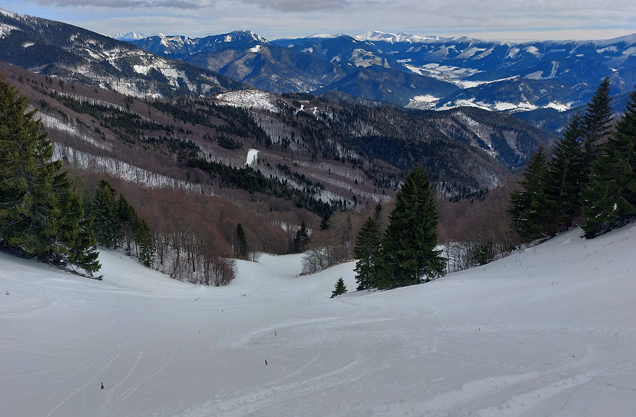 Na Skalnej Alpe vylízaný traverz až do ľadu, popri tyčiach ale aj trochu prachu a stopy relatívne komfortné. Vyhliadka na pomaly sa mračiace vrcholky Malej Fatry, zošup dole do jamy škrípavo-hrkotavý, so striedaním tvrdosti povrchov a trčiacimi kríkmi. Nižšie ale aj pár práškových oblúkov pre efekt sa zadarilo.