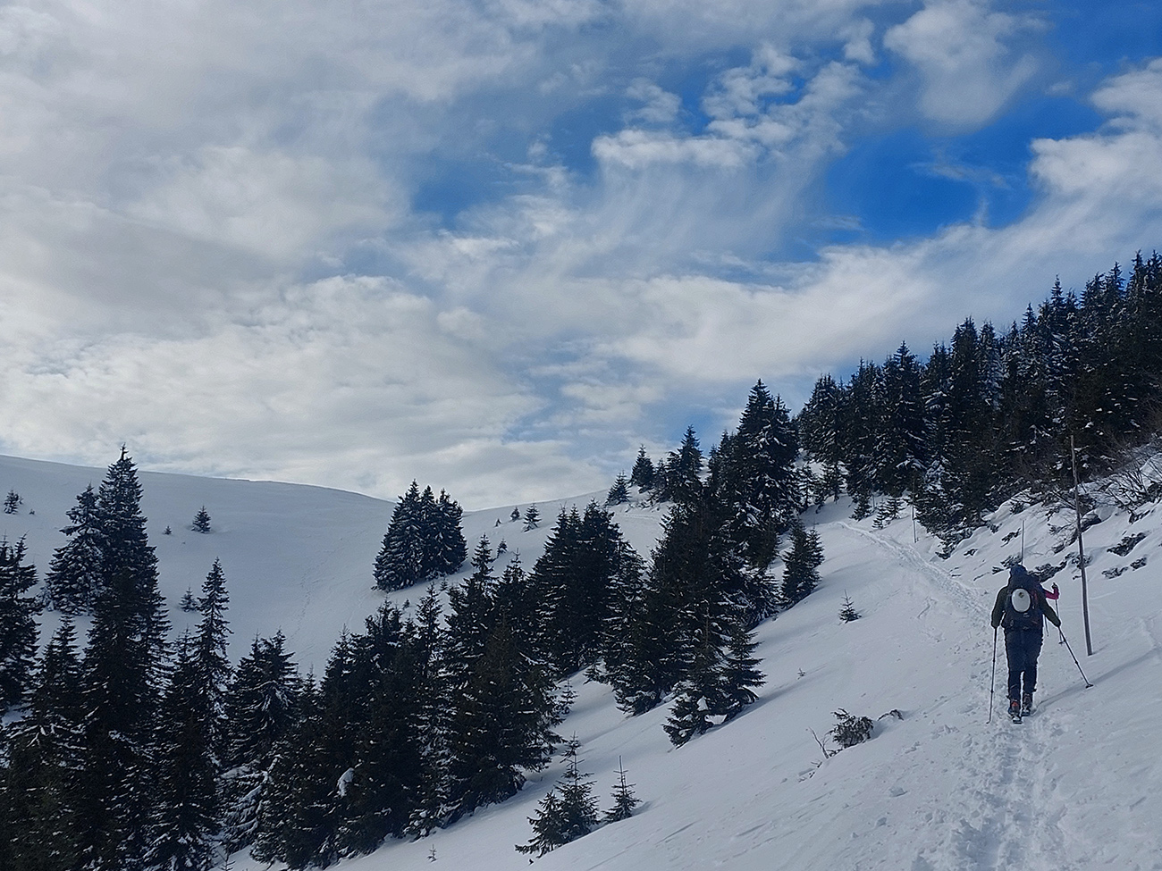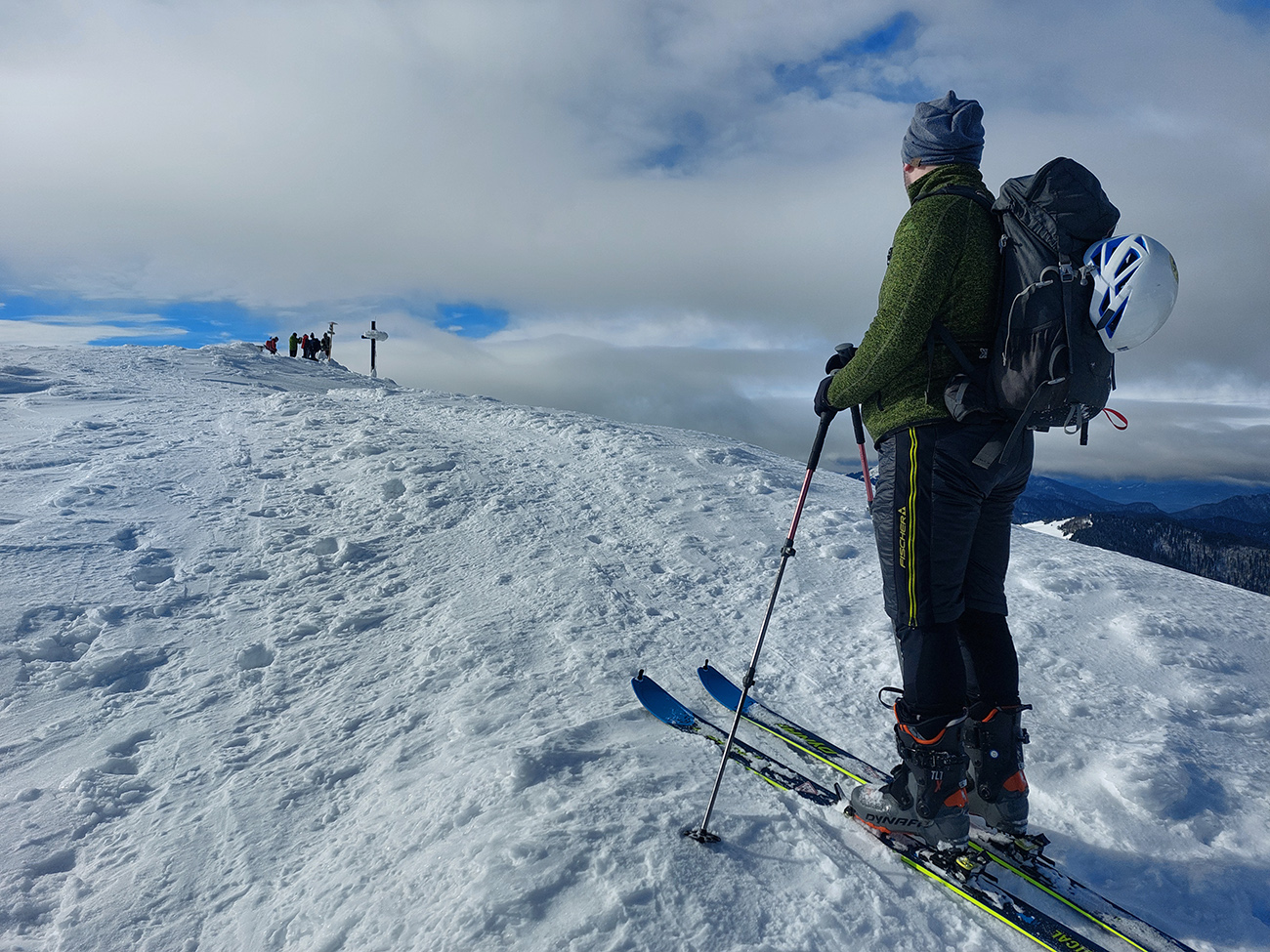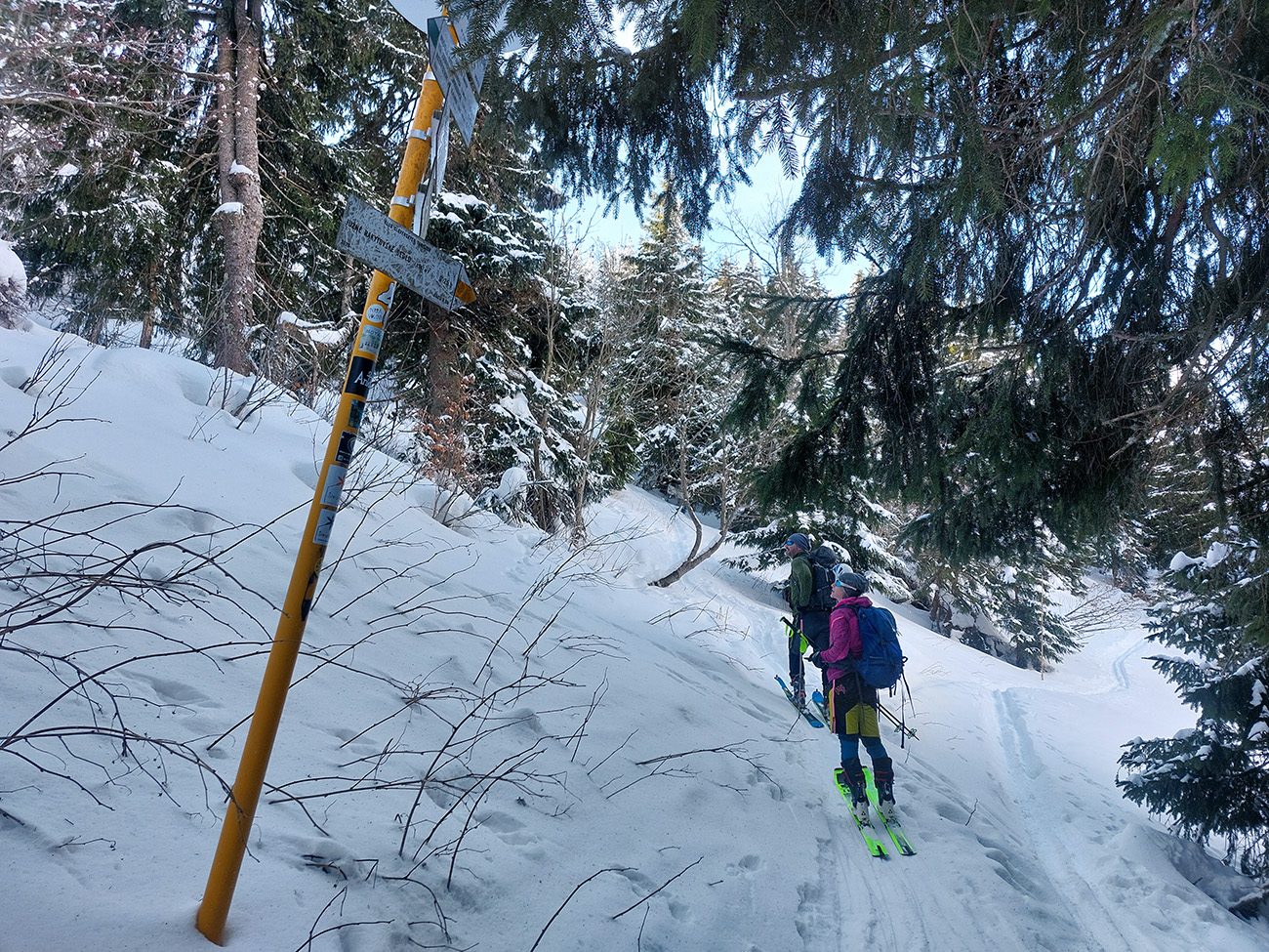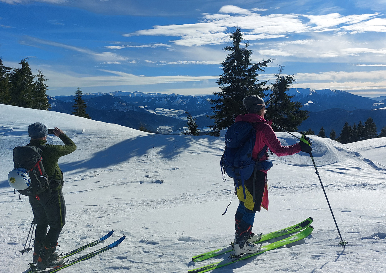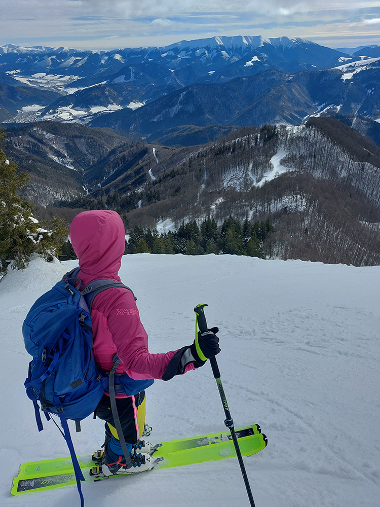 Lyžovačka od kríža po východnom rebre smerom k Limbe prekvapivo dobrá – na drsnom a tvrdom, ale takmer rovnom podklade. Občas snehová doska, nižšie už to na slnku vlhlo. Tak sme len zatočili doľava, na žltú značku, nalepili a davaj nazad do sedla. Tam je chodník pešiakmi z Limby predupaný poriadne.