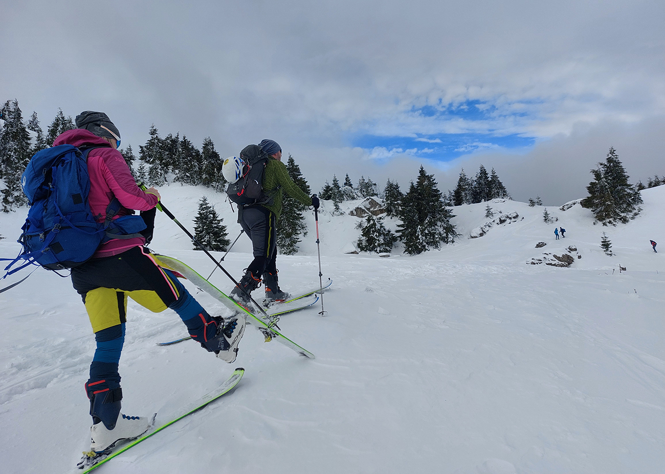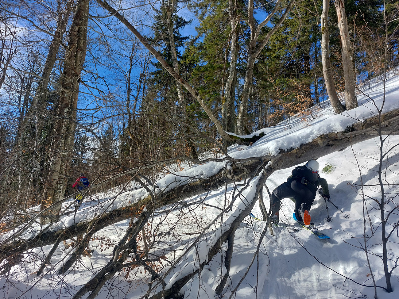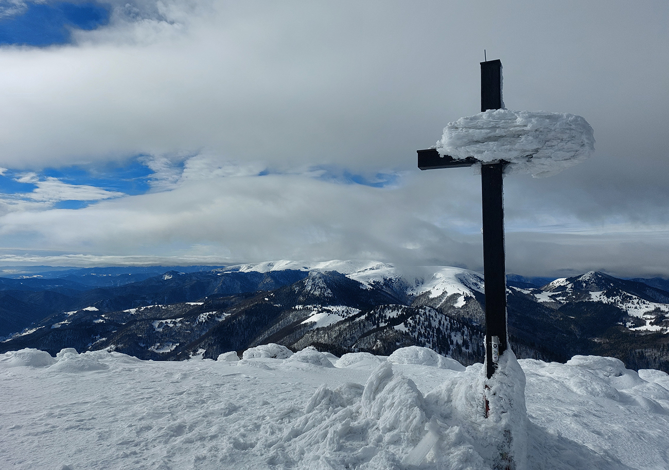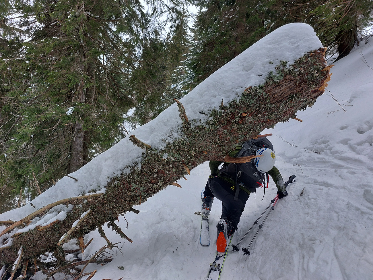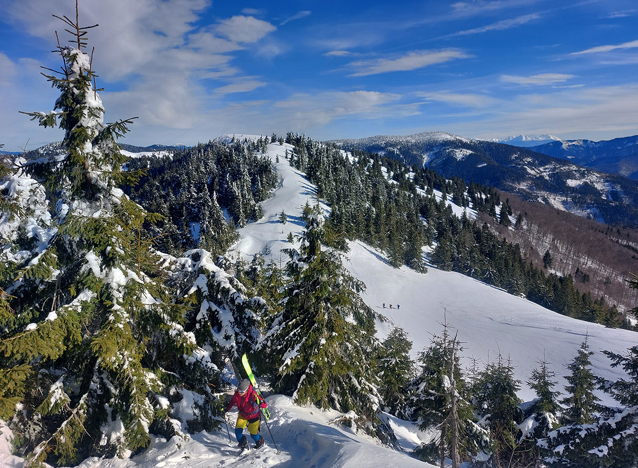 Lyžovačka od kríža po východnom rebre smerom k Limbe prekvapivo dobrá – na drsnom a tvrdom, ale takmer rovnom podklade. Občas snehová doska, nižšie už to na slnku vlhlo. Tak sme len zatočili doľava, na žltú značku, nalepili a davaj nazad do sedla. Tam je chodník pešiakmi z Limby predupaný poriadne.