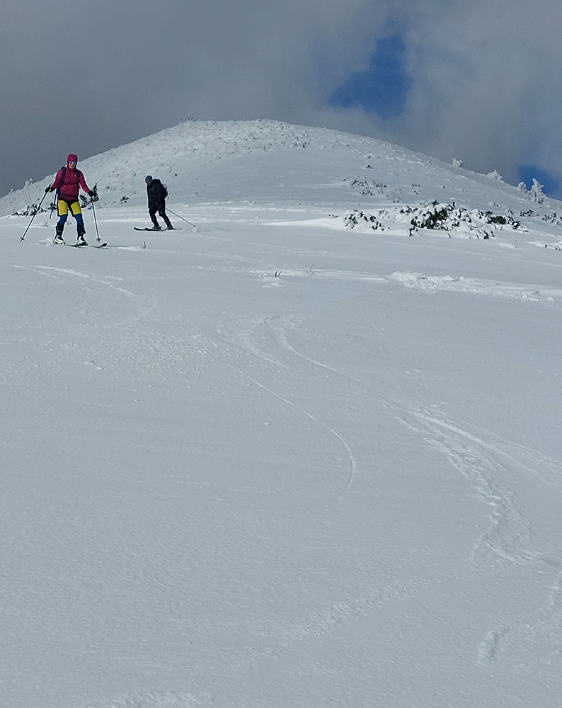 Traverz pod Rakytov komfortný (až na pár spartanských prekážočiek) – nový poprašok pomohol. Aj v strmších cikcakoch do Severného rakytovského sedla. Potom hore na vrchol radšej komfortnejšie s lyžami na hrboch – strmé je to, úzke a miestami ľadové. Machri to ale dávali na pásoch celé.